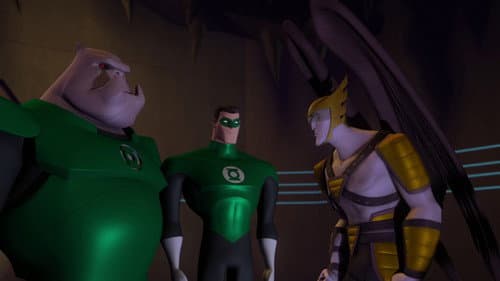 The Green Lanterns Hal and his partner Kilowog fight against the forces of the Red Lanterns.
